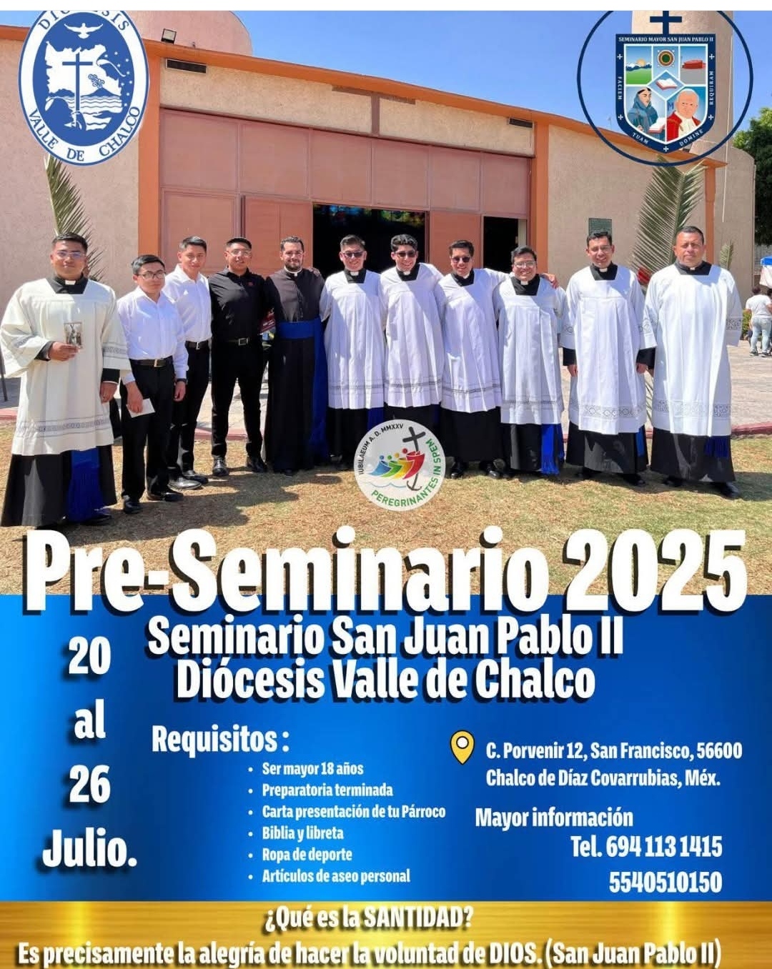 𝐏𝐫𝐞𝐬𝐞𝐦𝐢𝐧𝐚𝐫𝐢𝐨 𝟐𝟎𝟐𝟓 Del 20 al 26 de julio, en las instalaciones del Seminario Diocesano San Juan Pablo II. ¡Anímate a descubrir el llamado de Dios en una experiencia única! Mayores informes a los teléfonos 694 113 1415 y 5540 5101 50.