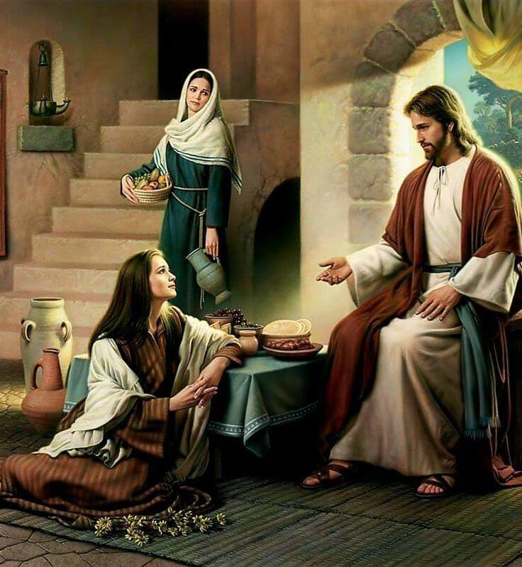 De nuevo, Jesús nos habla de la exigencia del Reino. Él fue hospedado en casa de tres hermanos: Lázaro, Marta y María. Cada uno de ellos tiene una forma muy diferente de mostrarle su acogida. Lázaro está compartiendo la mesa con Él, es el anfitrión, el señor de la casa y le trata con gran deferencia; Marta, se desvive por servirle, porque todo esté a punto ante su insigne huésped: “está inquieta y preocupada por muchas cosas”; y María, la hermana menor de ambos, está “sentada a los pies de Jesús” y no hace otra cosa mejor que escucharle: está embelesada, embobada con lo que dice sobre Dios y el Reino de los cielos. Ésta ha dado de lado todo lo que rodea al Maestro y sorbe y bebe los bienes de allá arriba que percibe con su presencia.