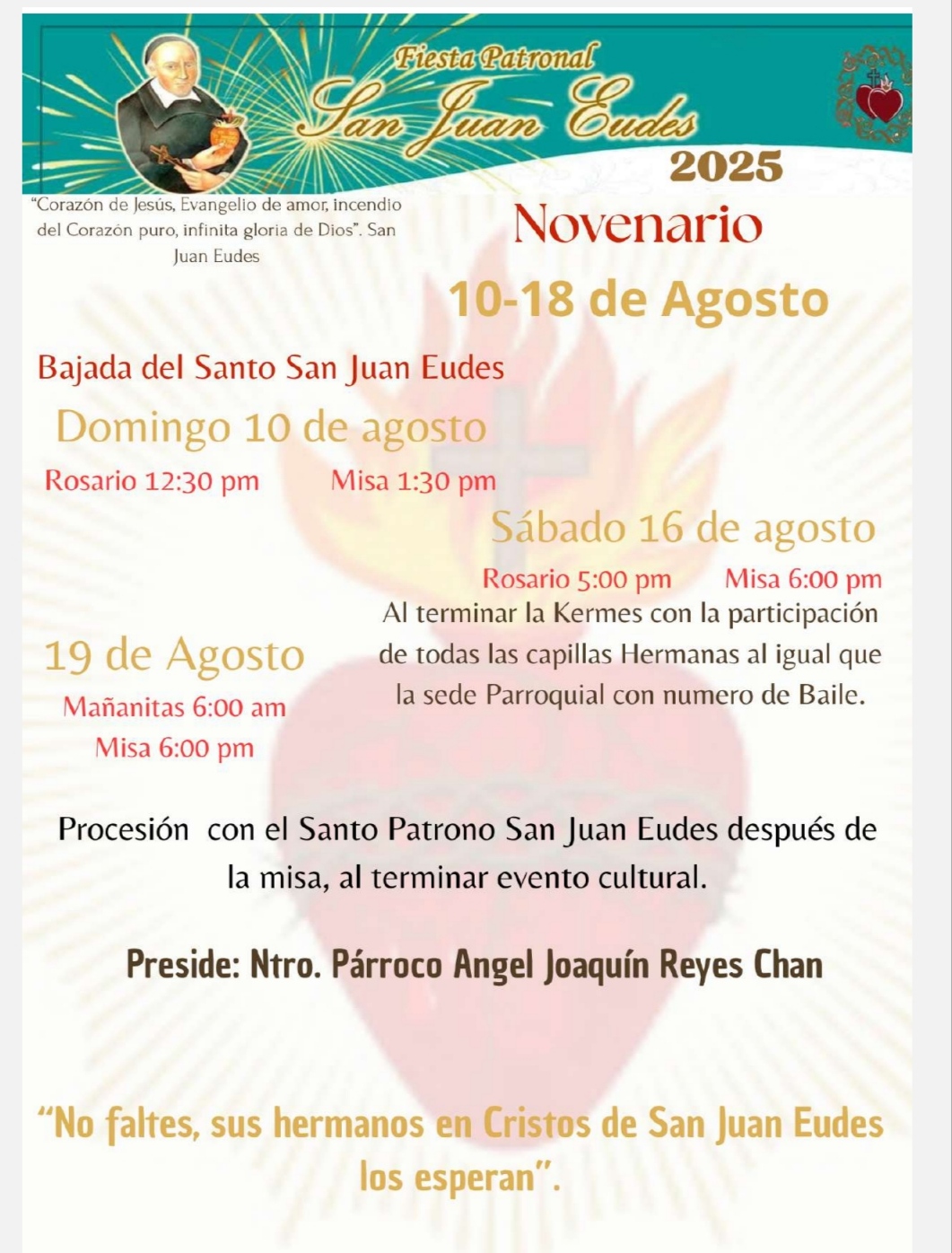 El día 19 de agosto la comunidad se reunirá a cantar las mañanitas a San Juan Eudes 6:00 am; Santa Misa 6:00 pm que presidirá el párroco, presbítero Ángel Joaquín Reyes Chan. Croquis para facilitar su ubicación: https://maps.app.goo.gl/cP233iHoAfuQxFtA6