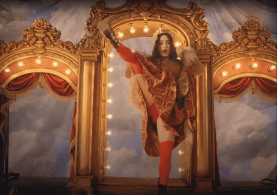 Vestida como un personaje circense más, rodeada de acróbatas y cabezudos, y levantándose la falda en medio de un espectáculo de baile.
