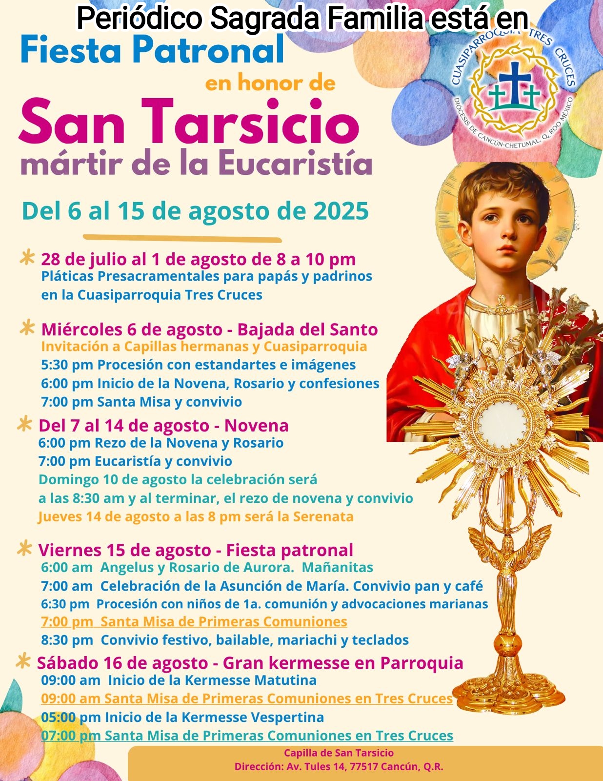 La comunidad eclesial del fraccionamiento Casas del Mar, celebra con devoción, júbilo y amor al Santo Patrono de la Eucaristía San Tarsicio en avenida Tules en Cancún.