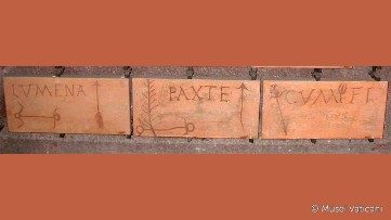 Se creyó que, inadvertidamente, se había invertido el orden de los tres fragmentos,  escritos entre el siglo III y IV d.C., y que en realidad tenía que leerse: «PAX TE / CUM FI / LUMENA” o sea: «La paz sea contigo, Filomena». Los signos decorativos alrededor del nombre, sobre todo la palma y las lanzas, hicieron pensar que los huesos pertenecían a una mártir cristiana de los primeros siglos. En esa época, en efecto, se consideraba que la mayor parte de los cuerpos presentes en las Catacumbas pertenecían a las persecuciones de la época apostólica.