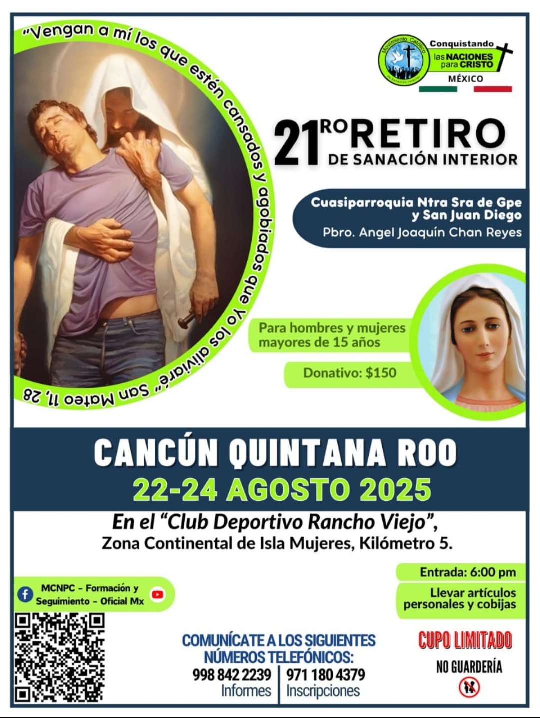 El Movimiento Conquistando las Naciones para Cristo (MCLNPC), hace una cordial invitación a la ciudadanía interesada en participar a su 21 retiro de sanación interior, dirigido a mujeres y varones mayores de 15 años. La cita es el 22—24 de agosto de 2025, en el Club Deportivo Rancho, kilómetro 5 en Ciudad Mujeres (Zona Continental de Isla Mujeres o Rancho Viejo). Entrada 6:00 pm. Requisitos llevar artículos y cobijas. Donativo 150 pesos. El cupo es limitado y no habrá servicio de guardería.