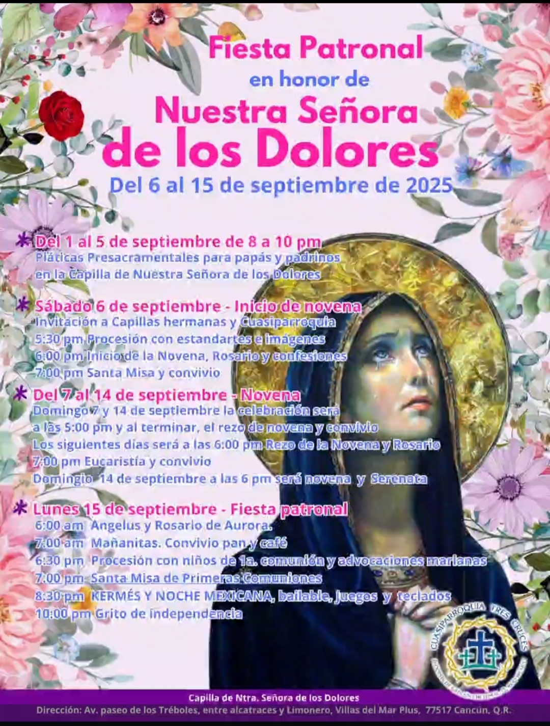 La cita es a partir de las 5:30 pm del 6 al 15 de septiembre de 2025 en la capilla ubicada entre las avenidas Paseo de los Tréboles, Alcatraces y Limonero en el fraccionamiento Villas del Mar Plus en Cancún