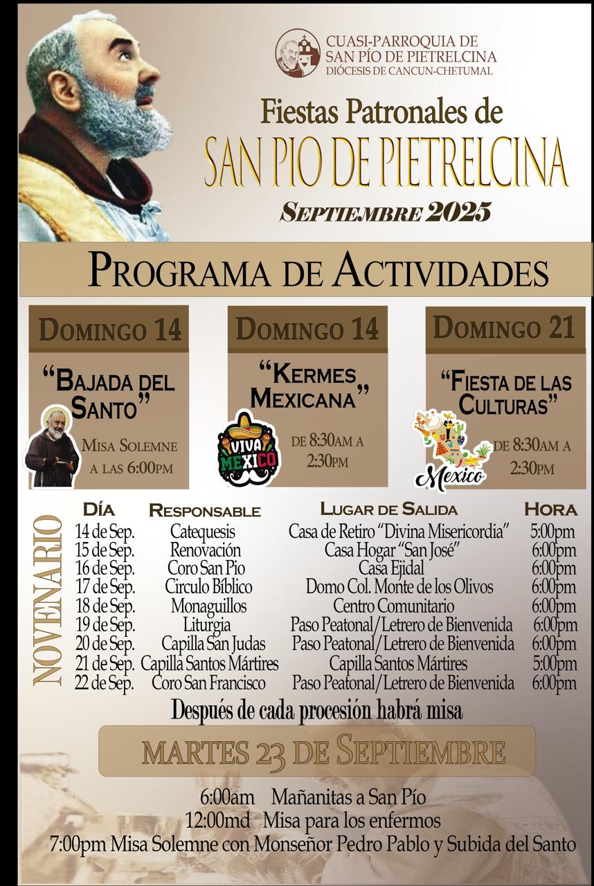 Inician fiestas patronales en honor de San Pío de Pieltrecina en la Cuasiparroquia y Santuario que lleva su nombre en Ciudad Mujeres.