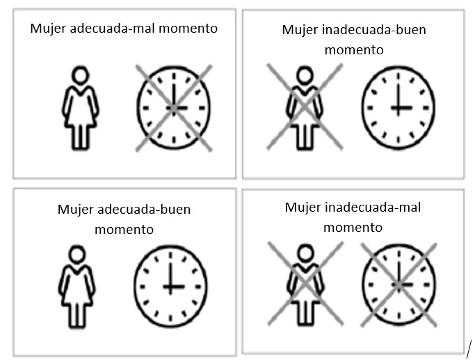 Si te sientes llamado al matrimonio, ¿dónde te encuentras en este momento? En la primera cuadrícula, está la chica adecuada, pero no es el momento adecuado. En la otra cuadrícula de la parte superior no es la chica adecuada, pero es el momento adecuado. Debajo encuentras la chica equivocada en el momento equivocado, nada bueno. Y finalmente, en el extremo izquierdo, es la chica adecuada, en el momento adecuado.