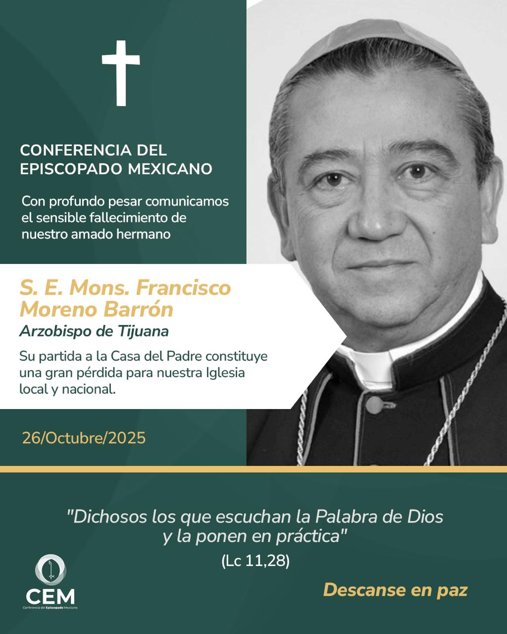 Por la información recibida de parte de Monseñor Mario Nicolás Villanueva, obispo auxiliar de la Arquidiócesis de Tijuana, les comunicamos el sensible fallecimiento de Monseñor Francisco Moreno Barrón, arzobispo de Tijuana, hermano nuestro que sirvió entre nosotros como obispo por 23 años.