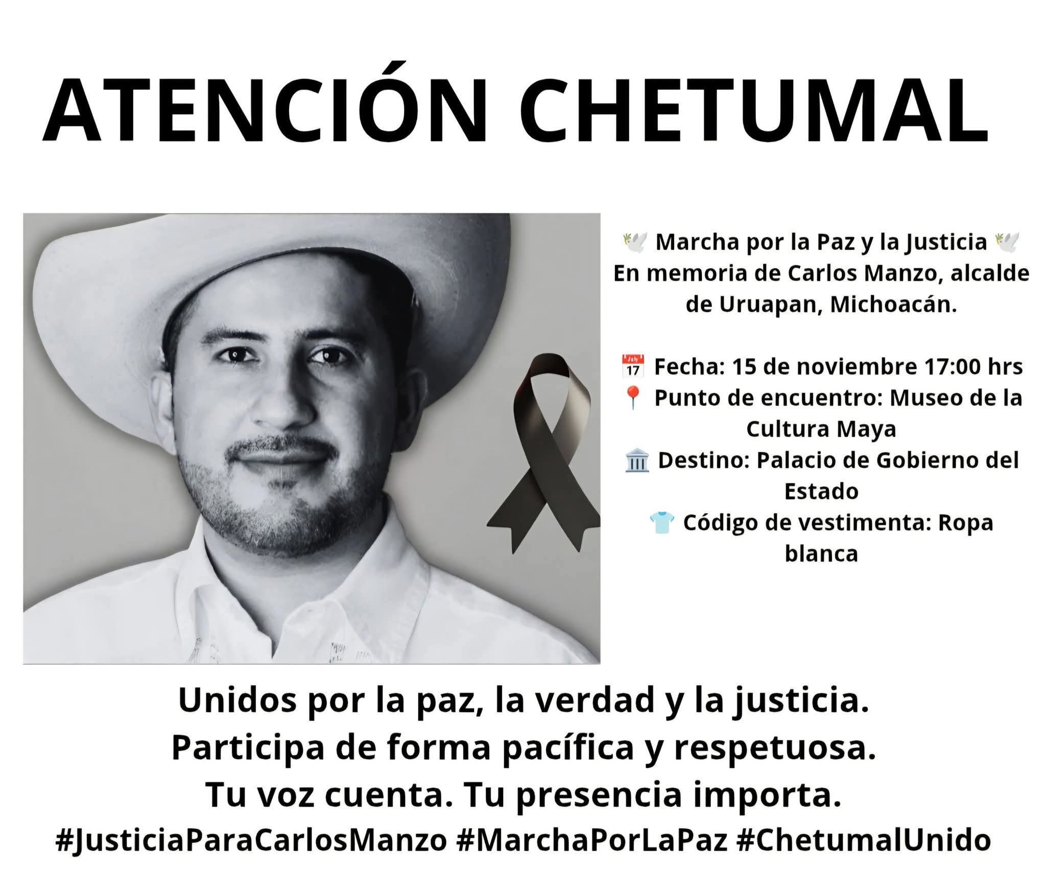 Punto de encuentro: Museo de la Cultura Maya a las 5:00 pm, Destino: Palacio de Gobierno de Quintana Roo. Vístete de blanco, como símbolo de paz, unión y amor por la vida. No marchamos por venganza, marchamos por justicia. Marchamos por Carlos. Marchamos por México.