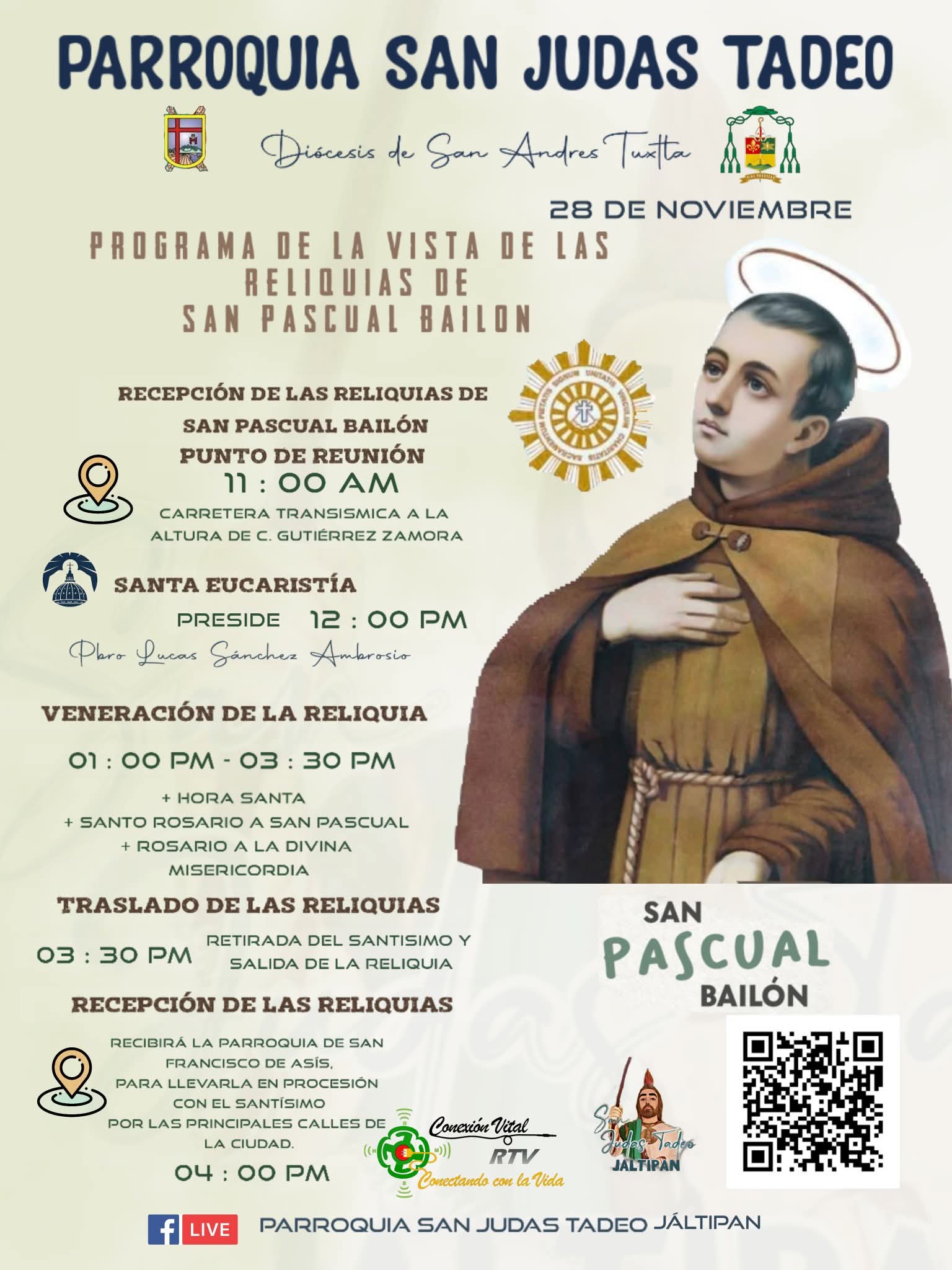 Jaltipan, Veracruz.— La comunidad católica se prepara a vivir una jornada de profunda fe y devoción el próximo 28 de noviembre, con la visita de las sagradas reliquias de San Pascual Bailón, el humilde fraile franciscano conocido como el “Santo de la Eucaristía” y patrón de los cocineros, que llegará a Jaltipan.