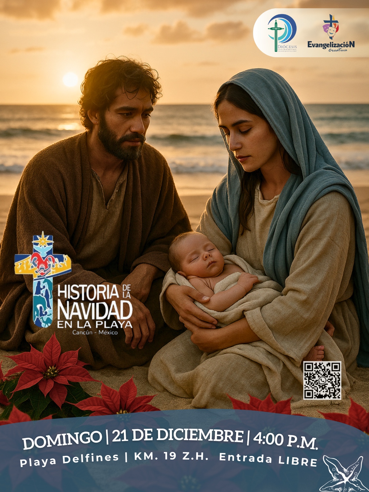 La diócesis Cancún—Chetumal a través de Evangelización Creativa invita a la comunidad y a los turistas a asistir y vivir esta experiencia que busca compartir un mensaje de esperanza y unión. Fecha: Domingo 21 de diciembre Lugar: Playa Delfines, Cancún Acceso: Gratuito.