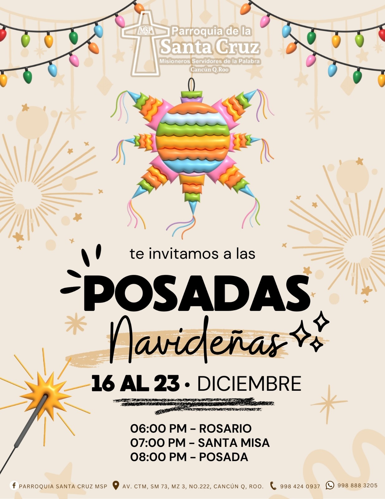 - La invitación es a vecinos y ciudadanos a participar en un ambiente familiar del Santo Rosario 6:00 pm; Santa Misa 7:00 pm y Pasada 8:00 pm en avenida CTM, Supermanzana 73, Manzana 3, Lote 22 en la parroquia de la Santa Cruz en Cancún.