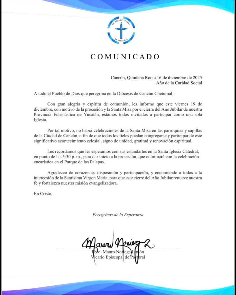 Cancún, Quintana Roo.— Con gran alegría y espíritu de comunión, les informo que este viernes 19 de diciembre, con motivo de la procesión y la Santa Misa por el cierre del año jubilar de nuestra provincia Eclesiástica de Yucatán, estamos todos invitados a participar como una sola Iglesia.