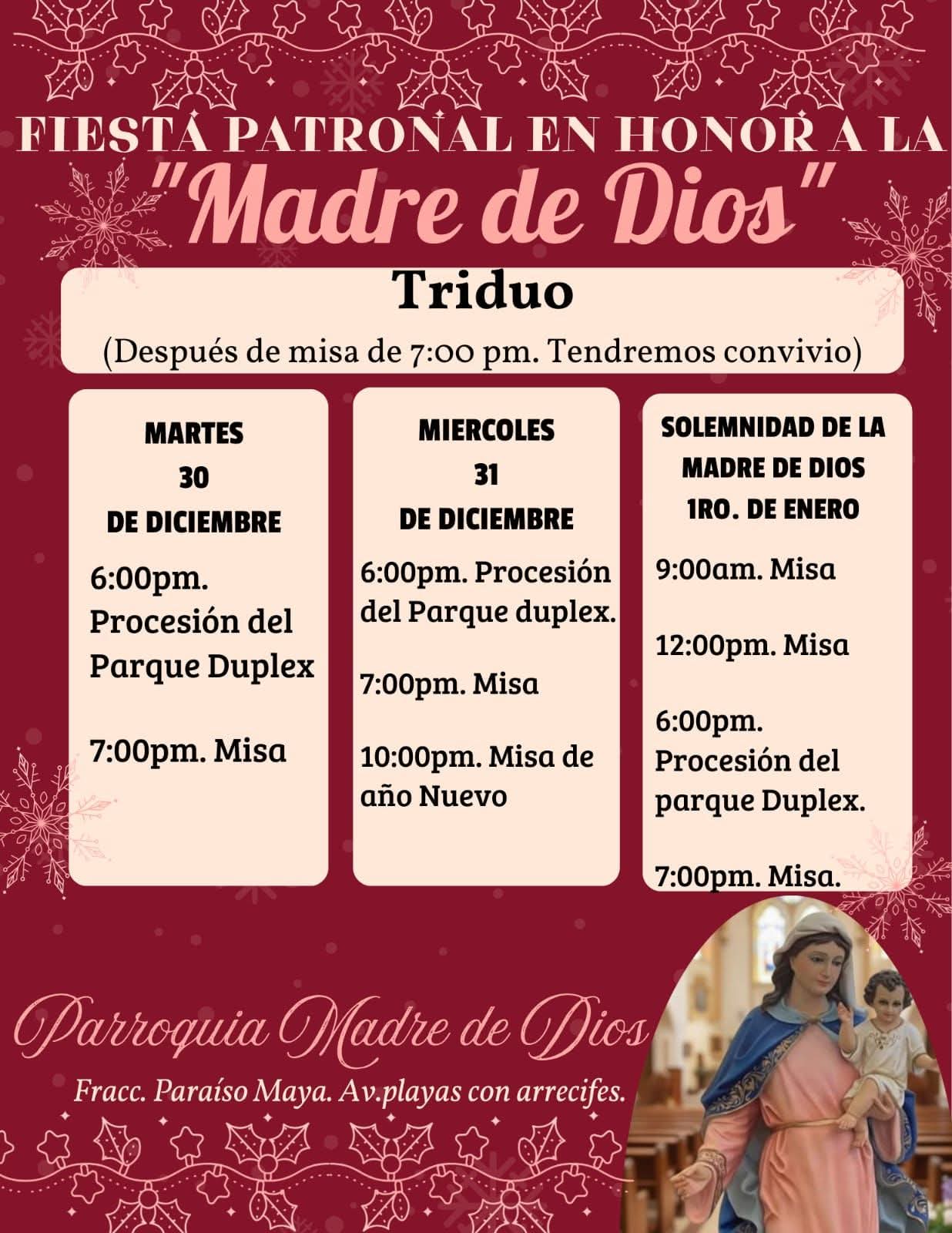 Cancún, Quintana Roo.— La comunidad parroquial, con gran alegría invita a toda la comunidad, vecinos y ciudadanos a vivir en unión familiar del Triduo en honor a la «Madre de Dios», en Cancún.