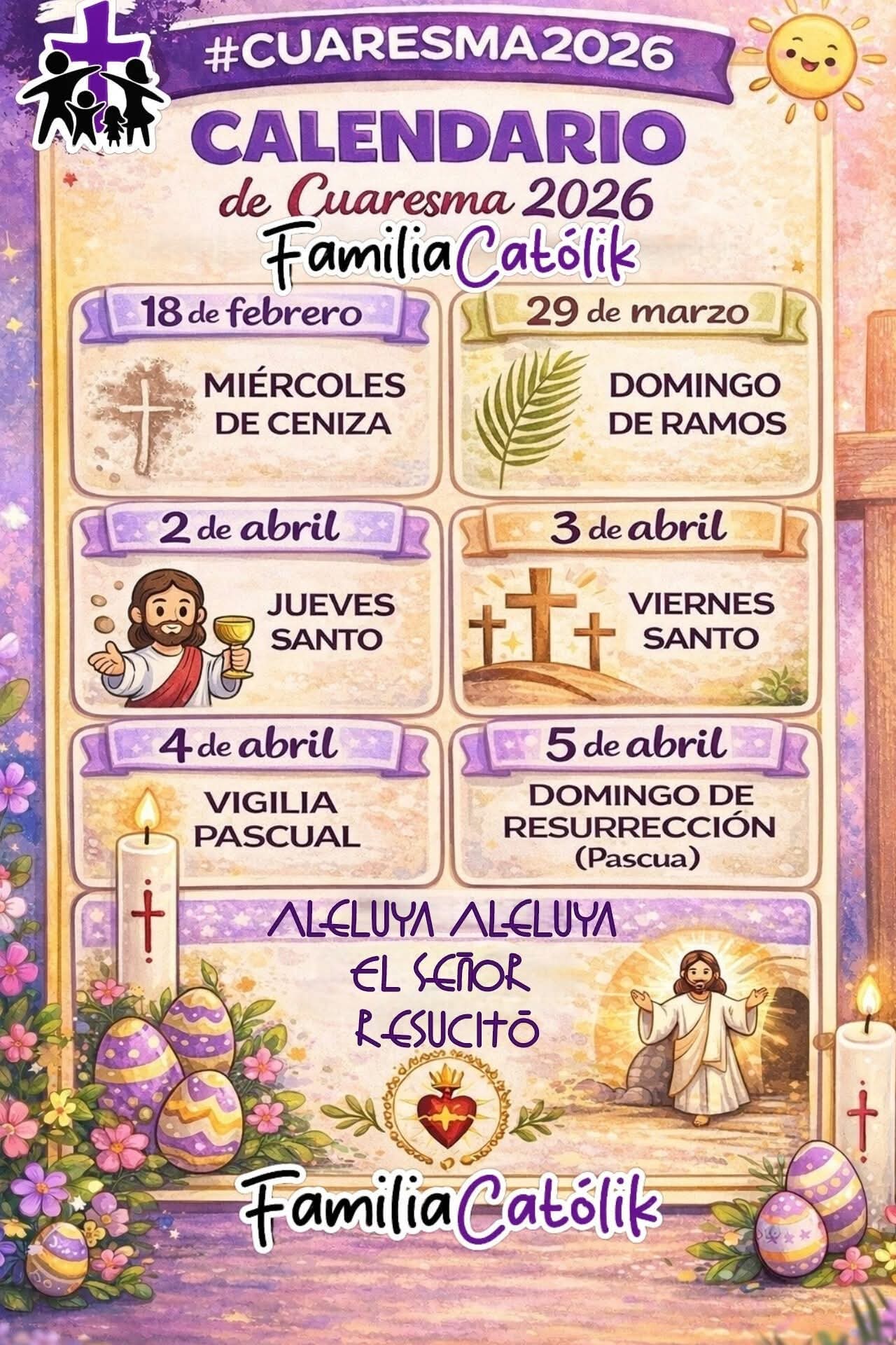 La Cuaresma 2026 inicia el 18 de febrero con el Miércoles de Ceniza, y finaliza el 2 de abril Jueves Santo, justo antes de la Misa de la Última Cena del Señor (cuando instituye el Orden Sacerdotal, la Eucaristía y el Sacramento del Amor), lo que marca el inicio de la Semana Santa.