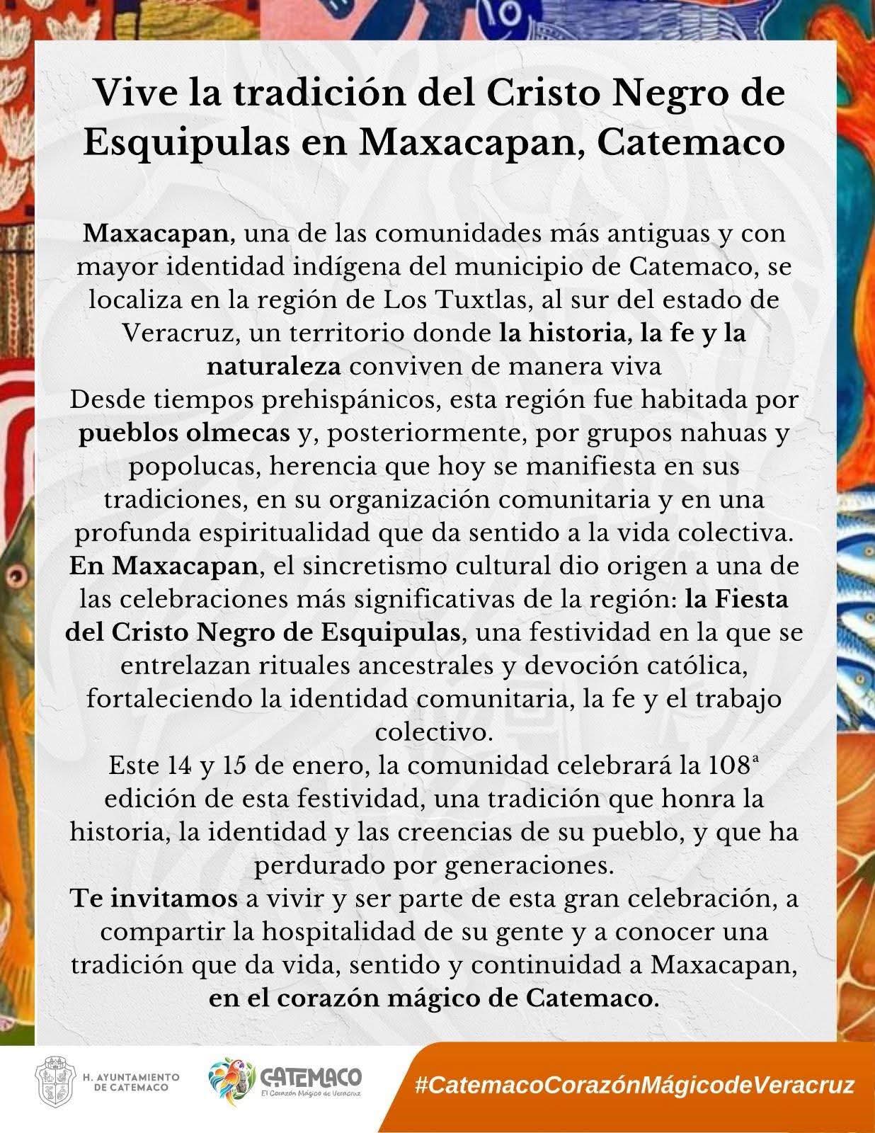 La 108 edición de la fiesta del Cristo Negro de Esquipulas en Maxacapan se realizará este 14 y 15 de enero de 2026 en Catemaco (Corazón Mágico de Veracruz).