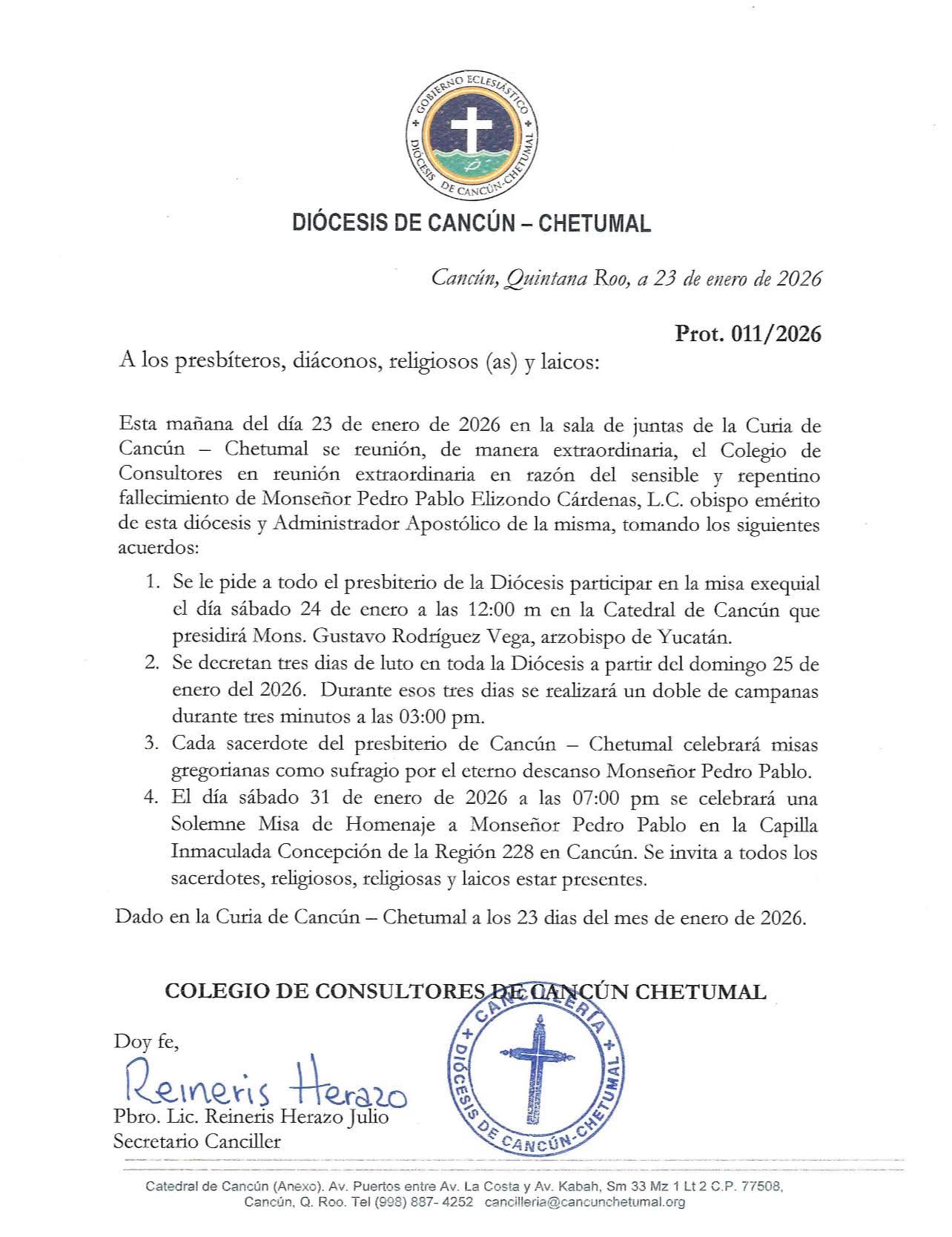 La Diócesis de Cancún–Chetumal informa que esta mañana, en reunión extraordinaria, el Colegio de Consultores ha tomado una serie de disposiciones tras el sensible y repentino fallecimiento de Monseñor Pedro Pablo Elizondo Cárdenas, L.C., obispo emérito y Administrador Apostólico de nuestra Iglesia particular.
