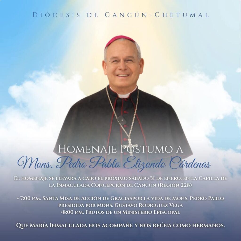 • Con un corazón agradecido a Dios y como familia diocesana, les extendemos una fraterna invitación a participar en el Homenaje Póstumo a Monseñor Pedro Pablo Elizondo Cárdenas, primer obispo de nuestra diócesis, pastor incansable que ha dejado una huella profunda de servicio, entrega y amor a nuestra Iglesia particular.