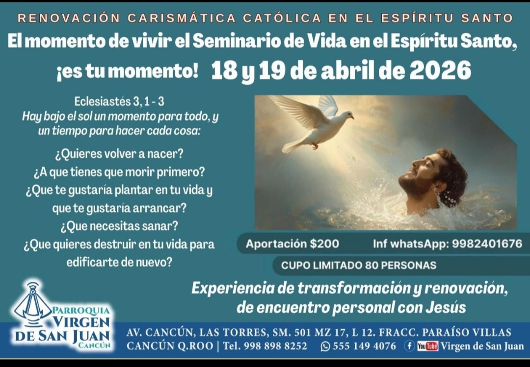 - Es momento de vivir el seminario de vida en el Espíritu Santo, ¡es tu momento!, el próximo 18 y 19 de abril de 2026; el cupo es limitado a 80 personas. Aportación 200 pesos.