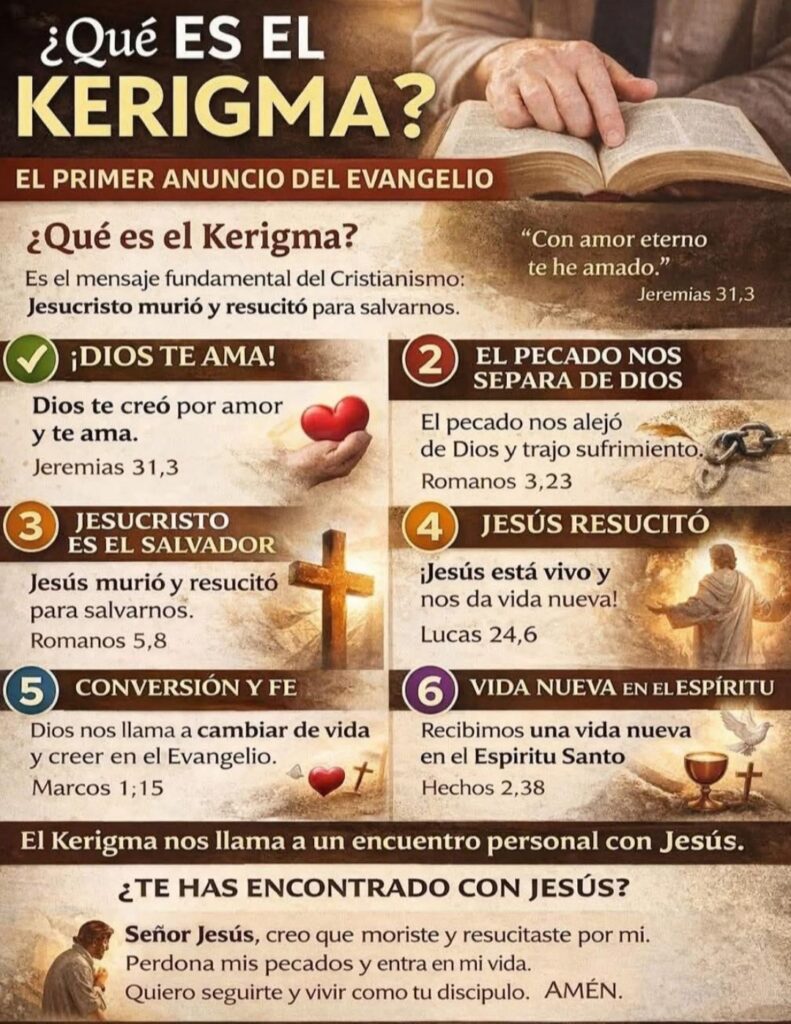 - El Kerigma, es el primer anuncio del Evangelio, es el mensaje fundamental del cristianismo: Nuestro Señor Jesucristo murió y resucitó para salvarnos. «Con amor eterno te he amado», Jeremías 31, 3. El llamado kerygmatico es tener un encuentro personal con el Señor Jesús, que suscita el Espíritu Santo.