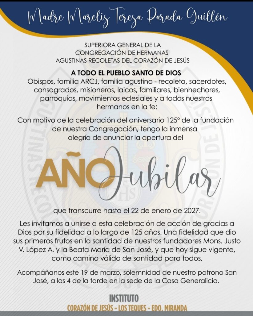 La Congregación de Hermanas Agustinas Recoletas del Corazón de Jesús, darán inicio a la apertura su año jubilar con motivo de los 125 años de fundación, el día 19 de marzo, Solemnidad de San José, en la sede de la Casa generalicia y de formación ubicada en Los Teques, Estado Miranda en Venezuela.